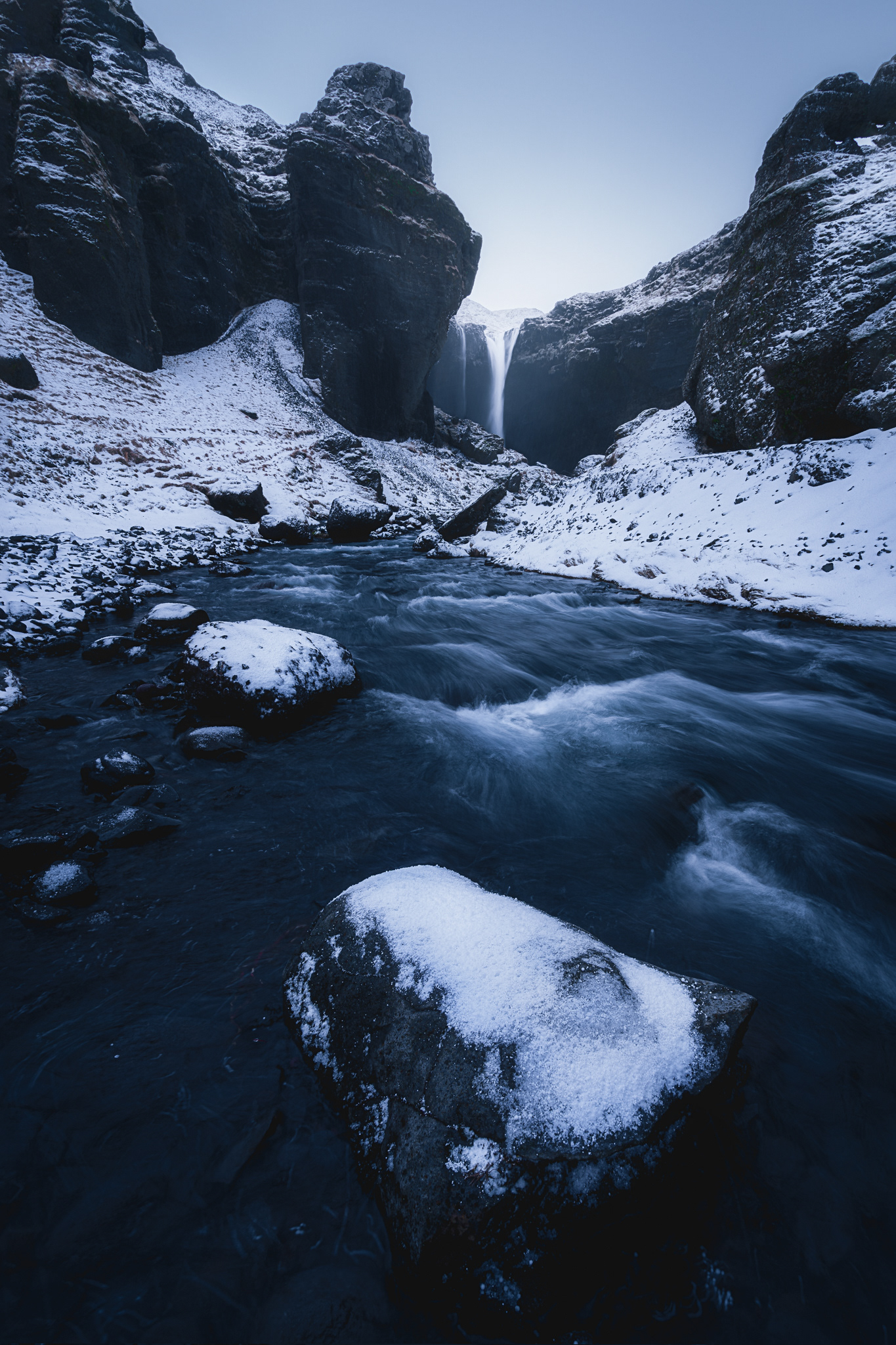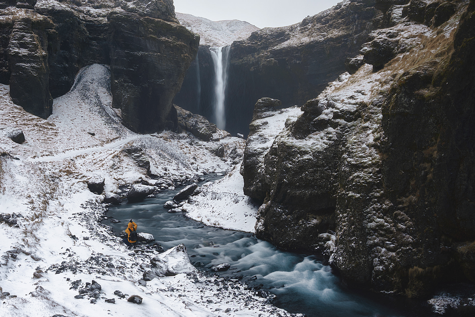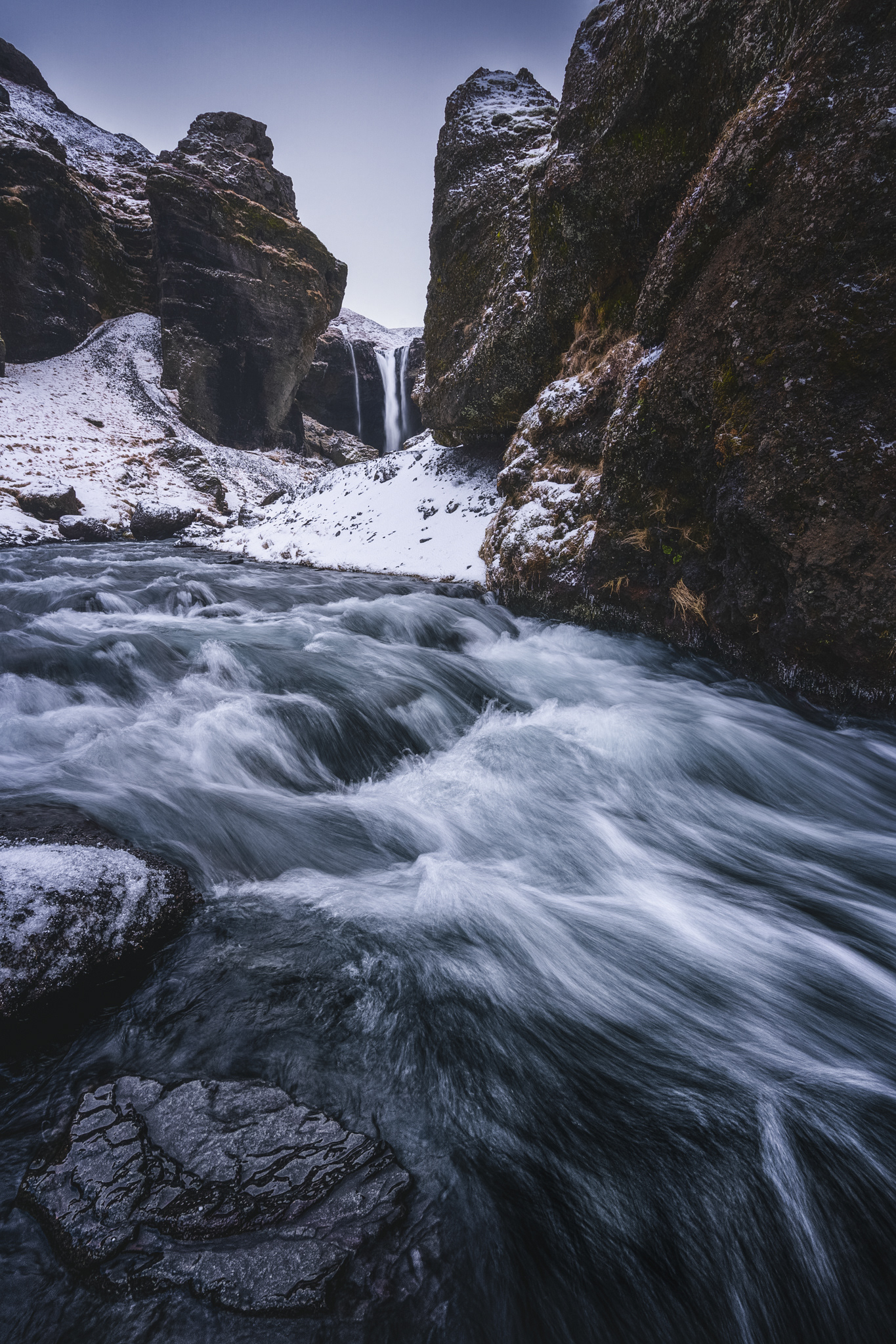 A solo unos pasos de la imponente Skógafoss, donde las multitudes se agolpan bajo toneladas de agua, descubrimos un secreto. Kvernufoss se esconde tras una grieta, apartada del bullicio, como si el paisaje quisiera guardar para sí un rincón de calma.
